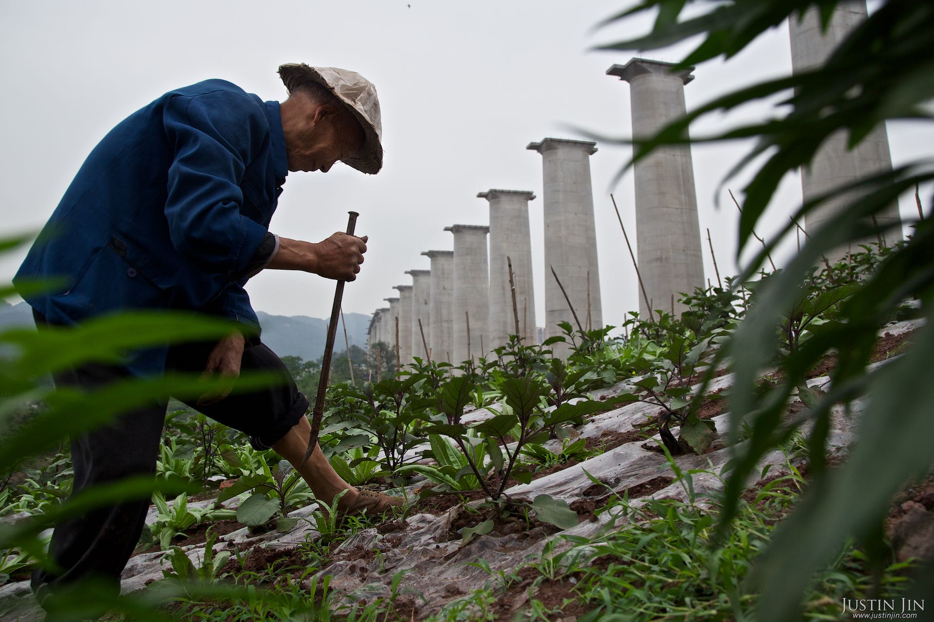 A Chinese farmer plants under a half-built rail bridge