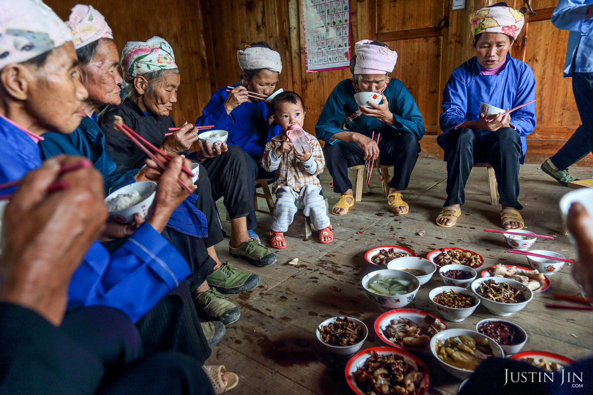 Old Chinese people gather to take care of the young