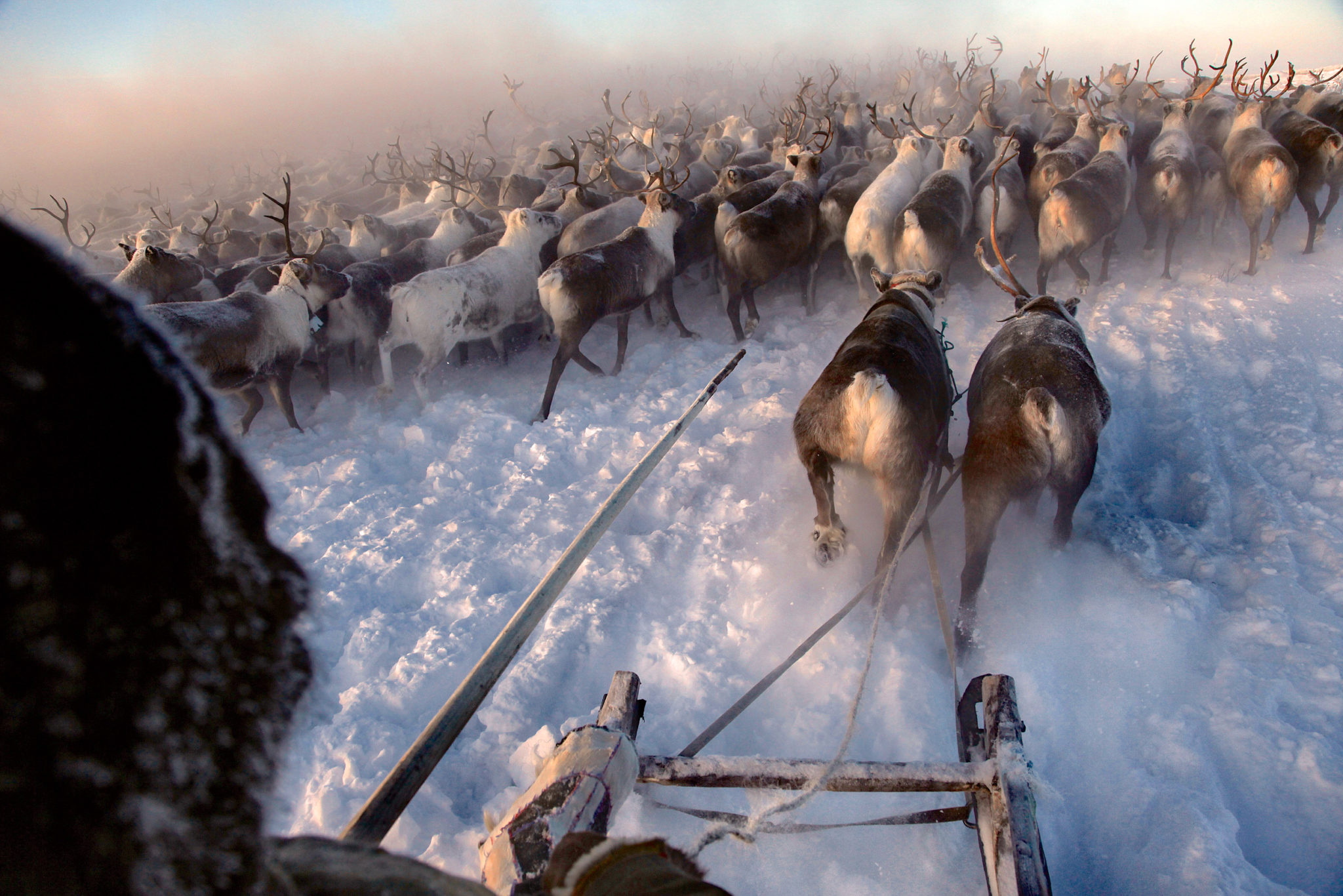 A Nenets herder collects his reindeers in -40C (-40F) in the Arctic tundra outside in the Russian Nenets Autonomous Region. They are the original inhabitants in the Russian Arctic before being displaced by Soviet collectivisation and modern gas and oil exploration.