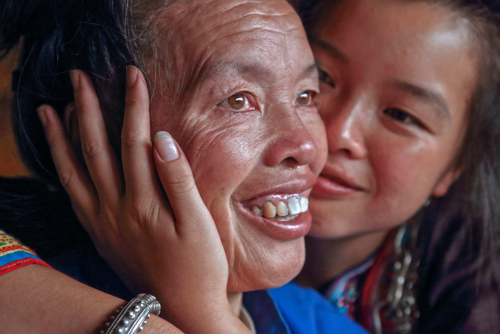 Ah Xia, 19, who grew up in a mountainous village in Guizhou, kisses Mother Wu after she gave her a dress and a wad of cash for Xia’s university in the provincial capital.