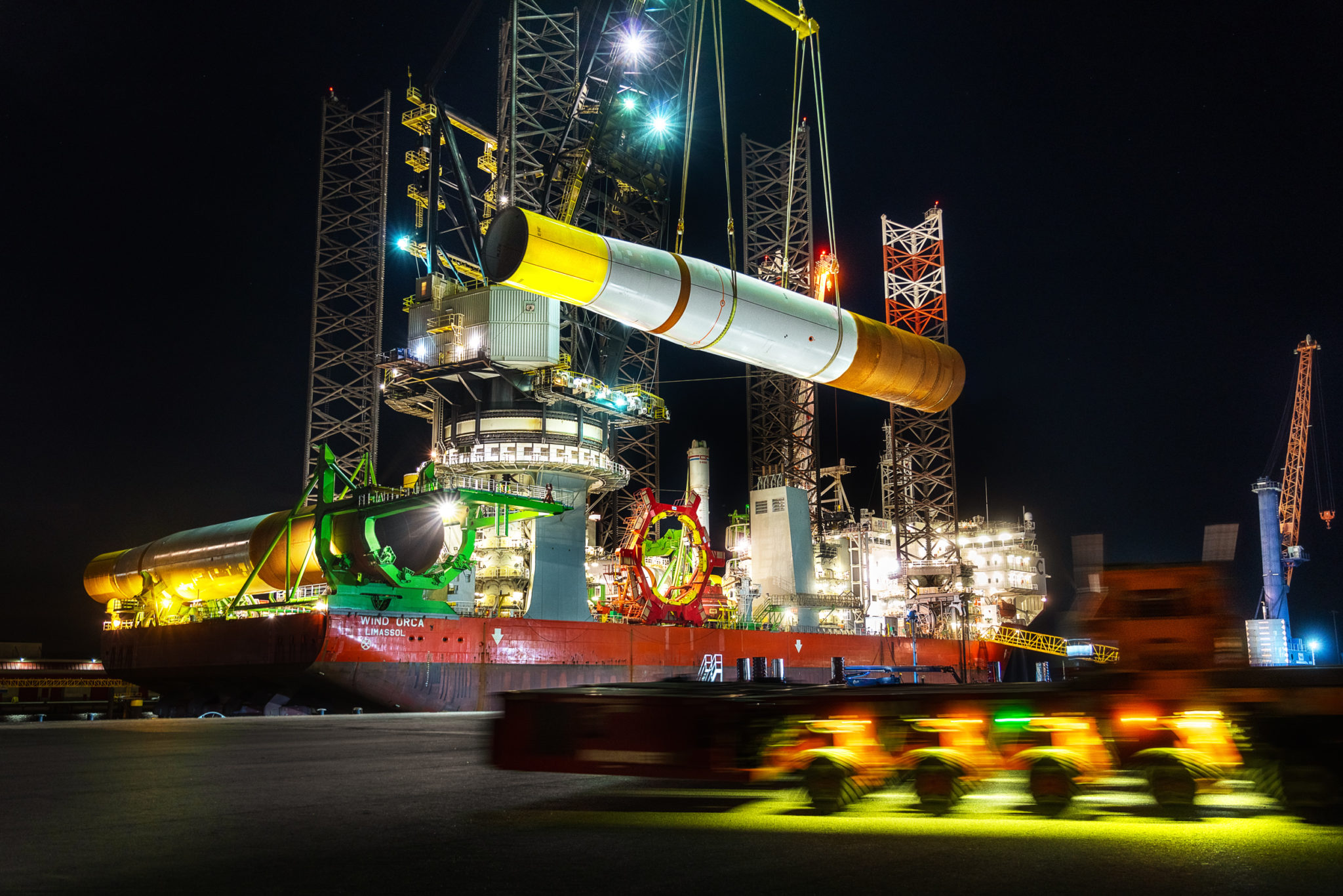 A supply ship in Eemshaven lifts the monopile of a wind turbine onboard, ready to be transported offshore.